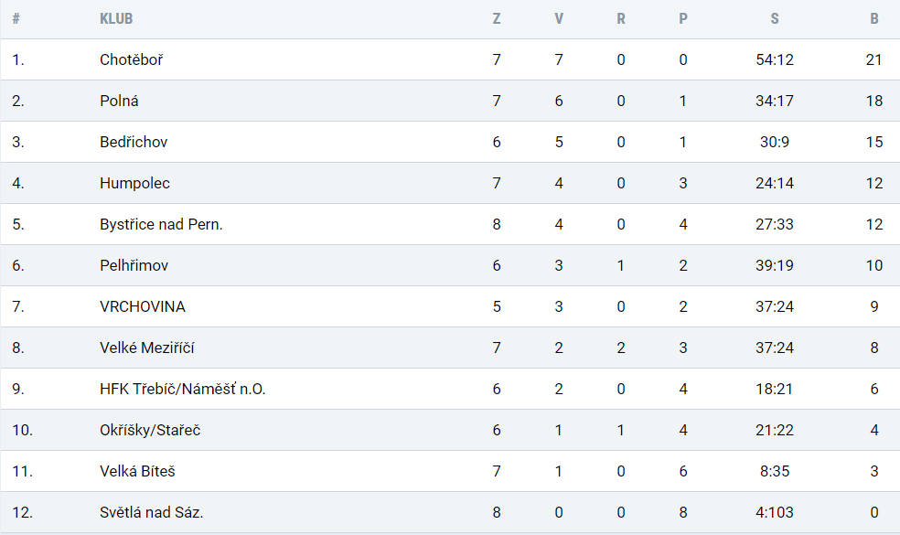 Tabulka v Okresním přeboru Žďáru nad Sázavou