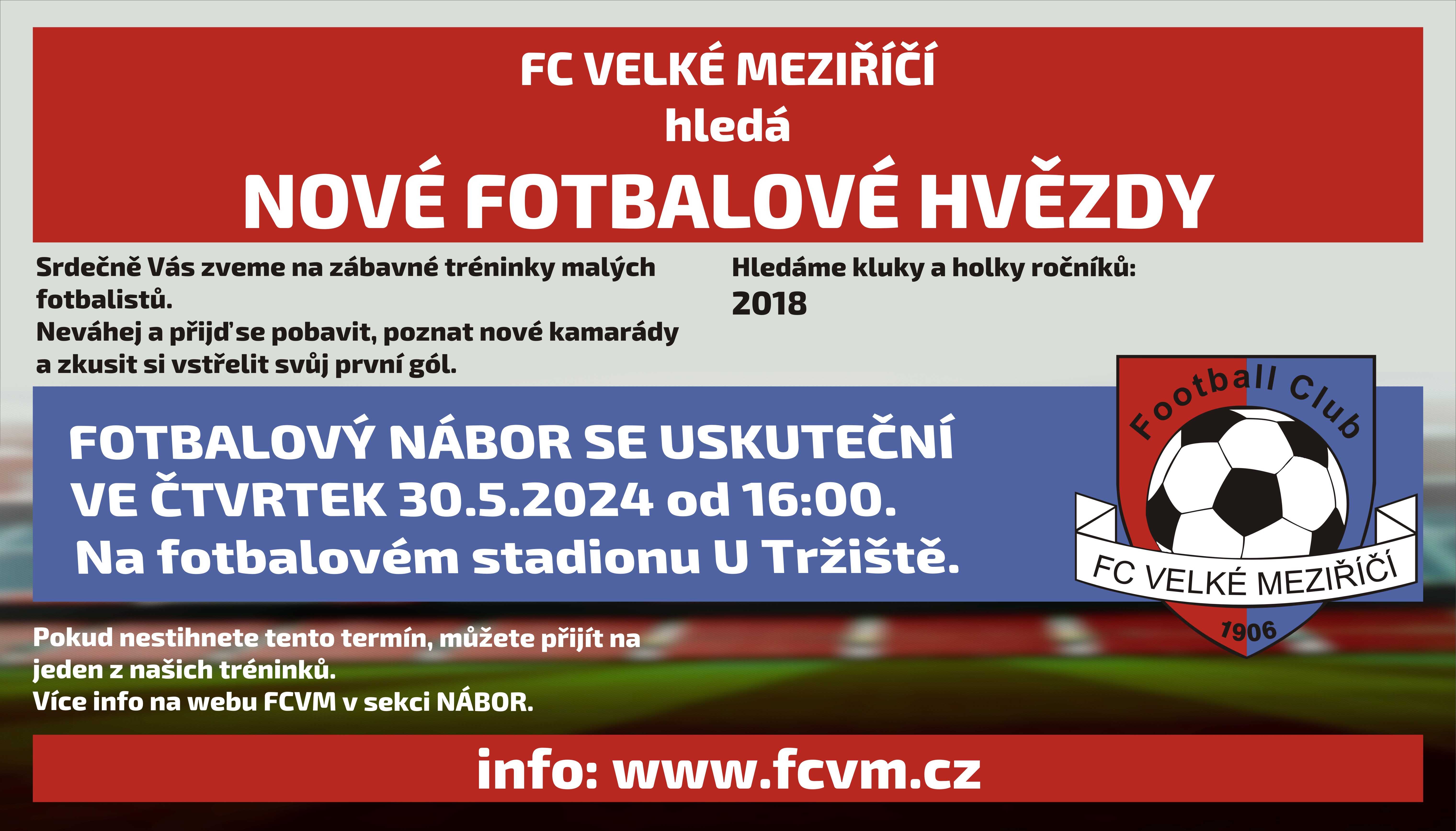 Máte doma malého fotbalistu nebo fotbalistku? Přijďte ve čtvrtek 30.5. 2024 v 16:00 na Tržiště na nábor do naší mládeže. Hledáme kluky a holky ročníku 2018.